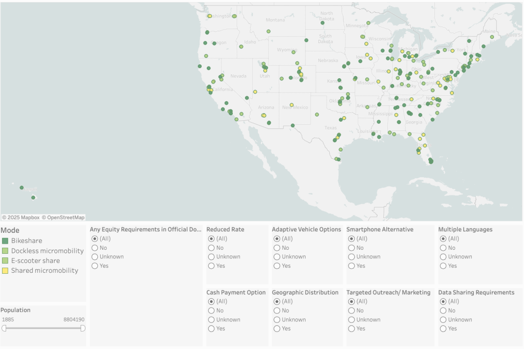 Read the research behind this tool: Mobility for the People, Equity Requirements in US Shared Micromobility Programs; Equity Requirements in US Micromobility Programs are on the Rise; From Paper to Practice, Shared Micromobility Equity Requirements Yield Mixed Outcomes
